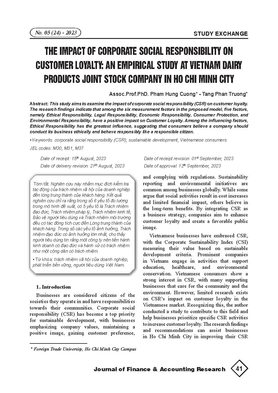 Tác động của trách nhiệm xã hội doanh nghiệp đối với lòng trung thành của khách hàng: Nghiên cứu thực nghiệm tại Công ty Cổ phần Sữa Việt Nam tại TP. HCM = The impact of corporate social responsibility on customer loyalty: An empirical study at Vietnam da