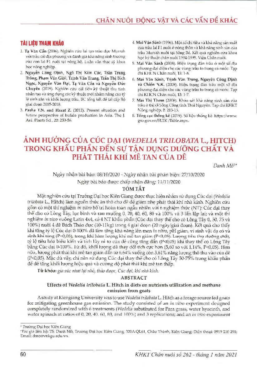Ảnh hưởng của cúc dại (wedelia trilobata l., hitch) trong khẩu phần đen sự tận dụng dưỡng chất và phát thải khí mê tan của dê = Effects of Wedelia trilobata L. Hitch in diets on nutrients utilization and methane emission from goats