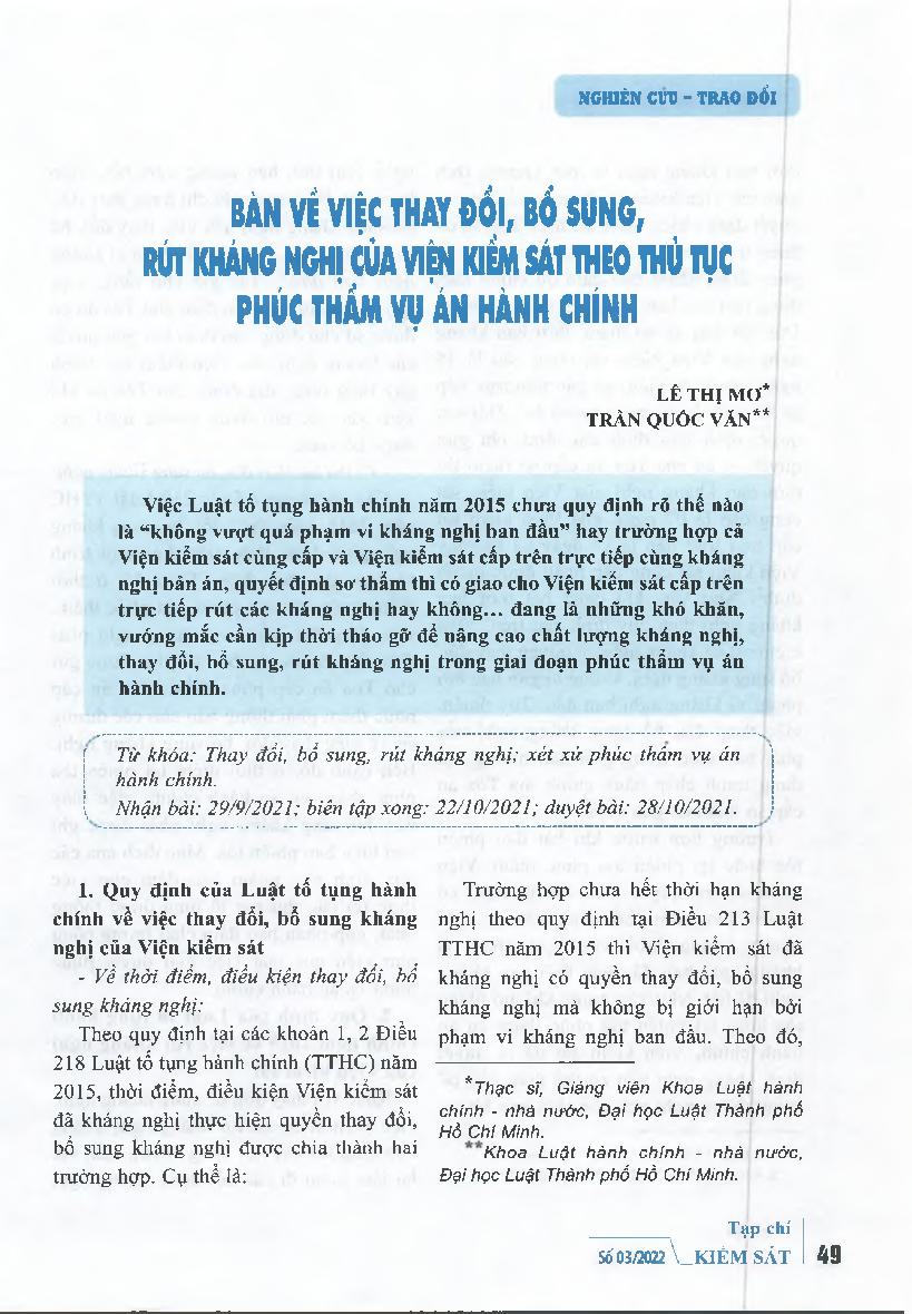 Bàn về việc thay đổi, bổ sung, rút kháng nghị của Viện kiểm sát theo thủ tục phúc thẩm vụ án hành chính