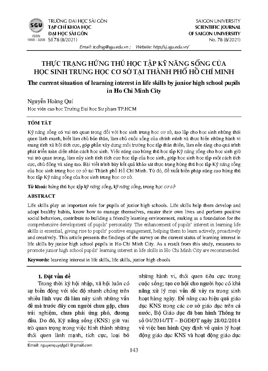 Thực trạng hứng thú học tập kỹ năng sống của học sinh trung học cơ sở tại Thành phố Hồ Chí Minh = The current situation of learning interest in life skills by junior high school pupils in Ho Chi Minh city