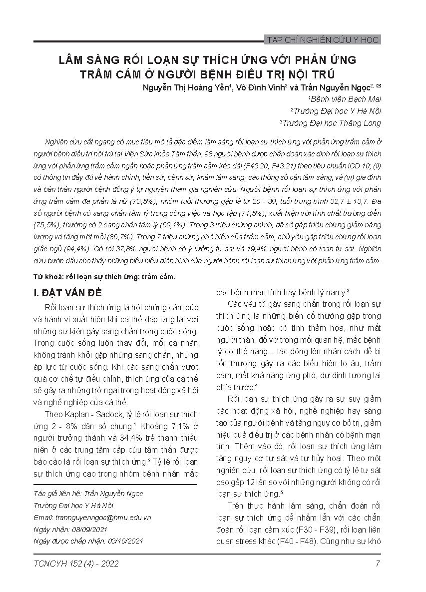 Lâm sàng rối loạn sự thích ứng với phản ứng trầm cảm ở người bệnh điều trị nội trú = Clinical characteristics of adjustment disorder with depressed reaction in inpatients in the national institute of mental health