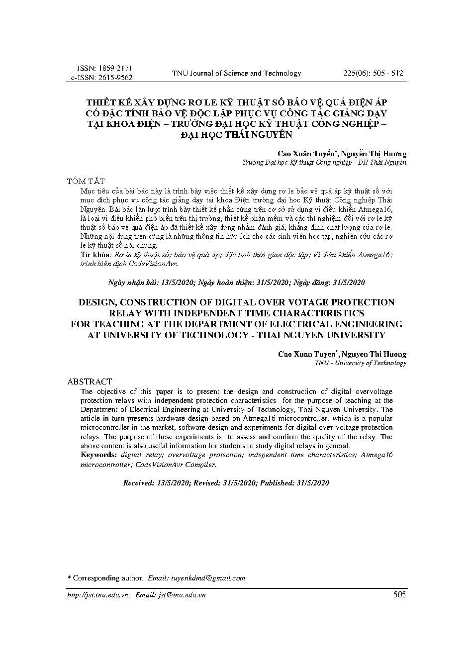 THIẾT KẾ XÂY DỰNG RƠ LE KỸ THUẬT SỐ BẢO VỆ QUÁ ĐIỆN ÁP CÓ ĐẶC TÍNH BẢO VỆ ĐỘC LẬP PHỤC VỤ CÔNG TÁC GIẢNG DẠY TẠI KHOA ĐIỆN – TRƯỜNG ĐẠI HỌC KỸ THUẬT CÔNG NGHIỆP – ĐẠI HỌC THÁI NGUYÊN = DESIGN, CONSTRUCTION OF DIGITAL OVER VOTAGE PROTECTION RELAY WITH INDEPENDENT TIME CHARACTERISTICS FOR TEACHING AT THE DEPARTMENT OF ELECTRICAL ENGINEERING AT UNIVERSITY OF TECHNOLOGY - THAI NGUYEN UNIVERSITY
