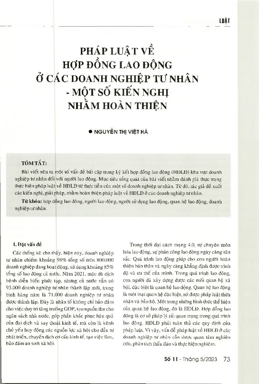 Pháp luật về hợp đồng lao động ở các doanh nghiệp tư nhân - Một số kiến nghị nhằm hoàn thiện
