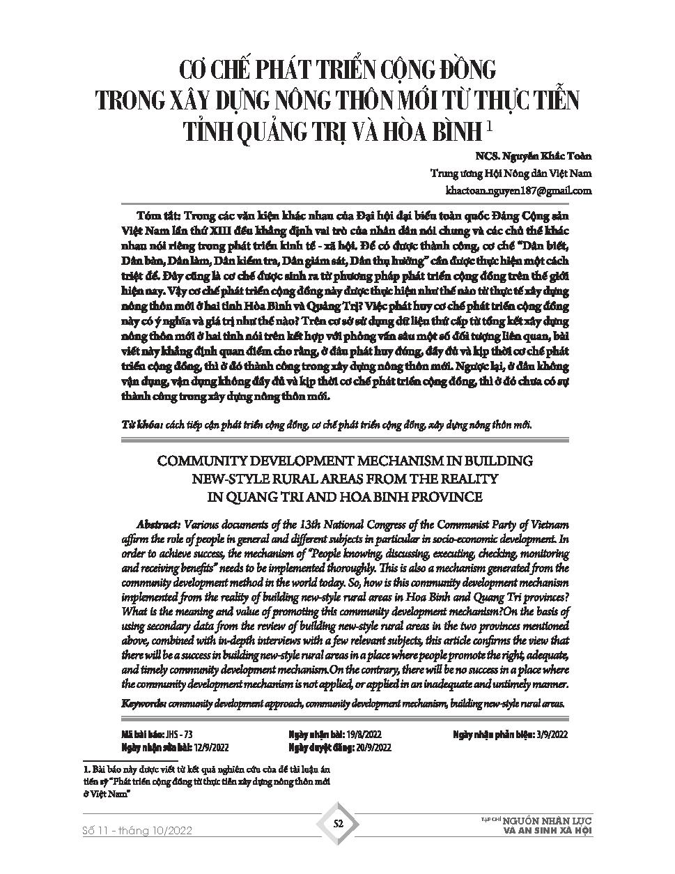 Cơ chế phát triển cộng đồng trong xây dựng nông thôn mới từ thực tiễn tỉnh Quảng Trị và Hòa Bình = Community development mechanism in building new-style rural areas from the reality in Quang Tri and Hoa Binh province