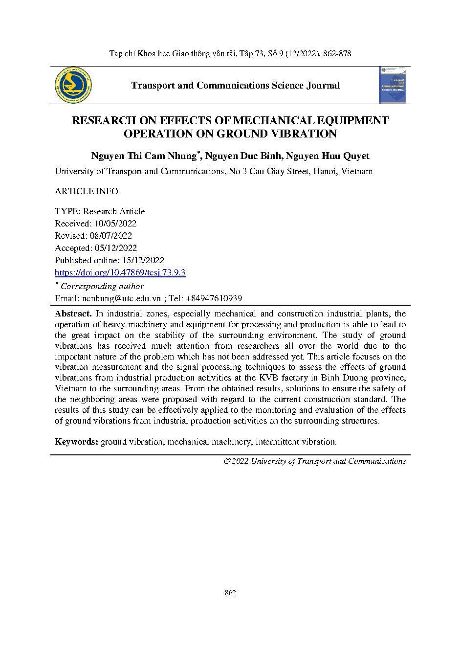 Nghiên cứu ảnh hưởng khi vận hành thiết bị cơ khí tới rung động đất nền = Research on effects of mechanical equipment operation on ground vibration