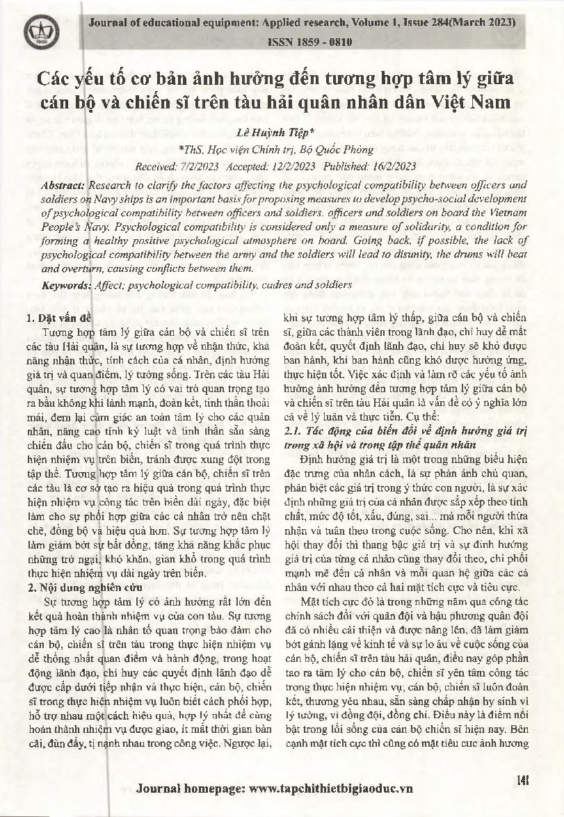 Các yếu tố cơ bản ảnh hưởng đến tương hợp tâm lý giữa cán bộ và chiến sĩ trên tàu hải quân nhân dân Việt Nam = Basic factors affecting psychological compatibility between officers and soldiers on Vietnamese people's navy ships