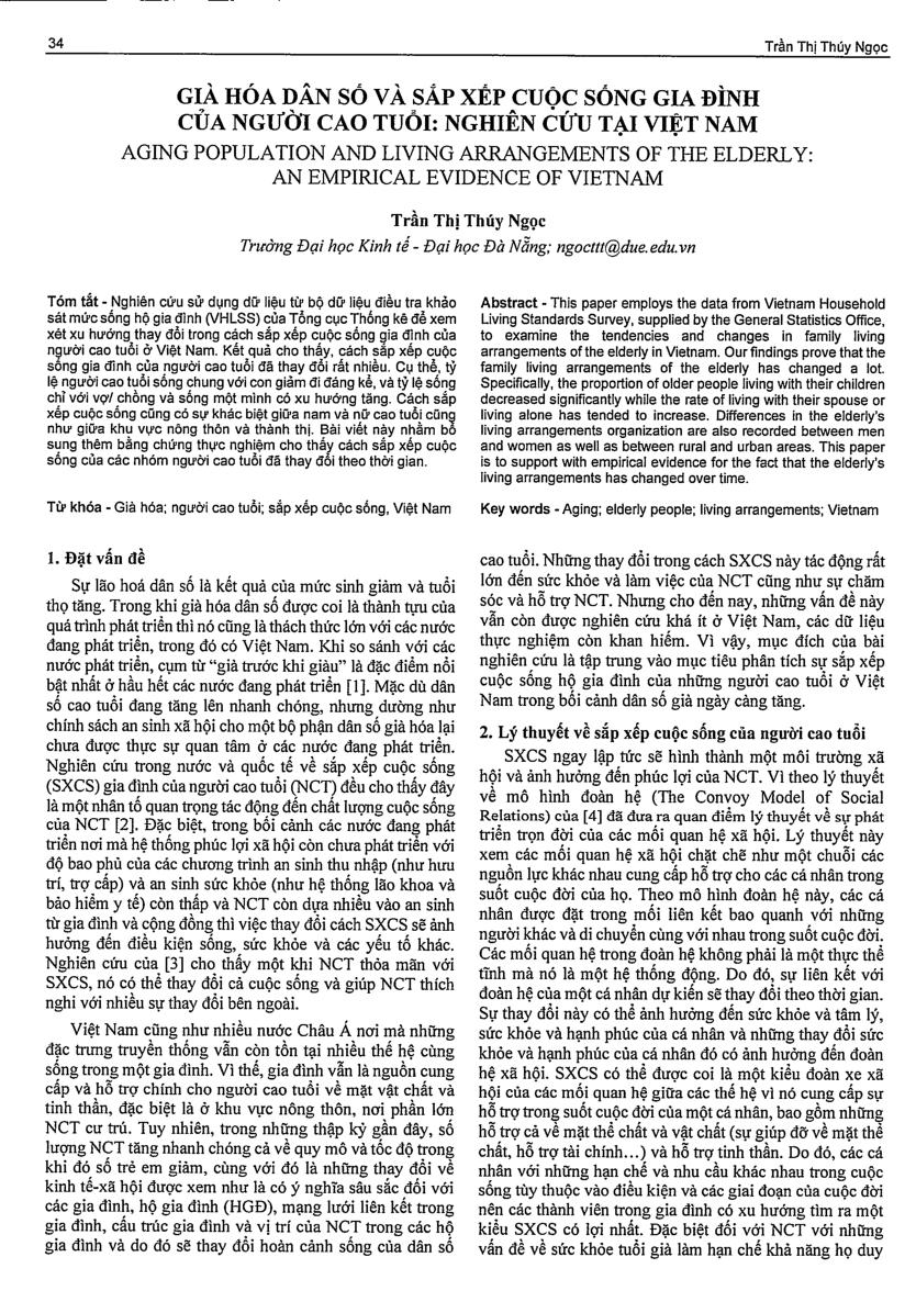 Già hóa dân số và sắp xếp cuộc sống gia đình của người cao tuổi: Nghiên cứu tại Việt Nam = Aging population and living arrangements of the elderly: an empirical evidence of Vietnam