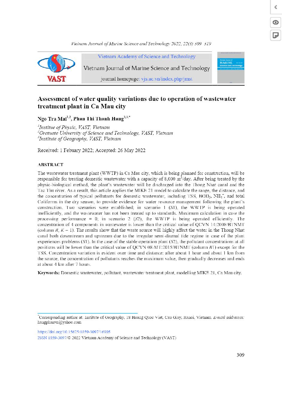 Đánh giá diễn biến chất lượng nước do vận hành nhà máy xử lý nước thải thành phố Cà Mau = Assessment of water quality variations due to operation of wastewater treatment plant in Ca Mau city