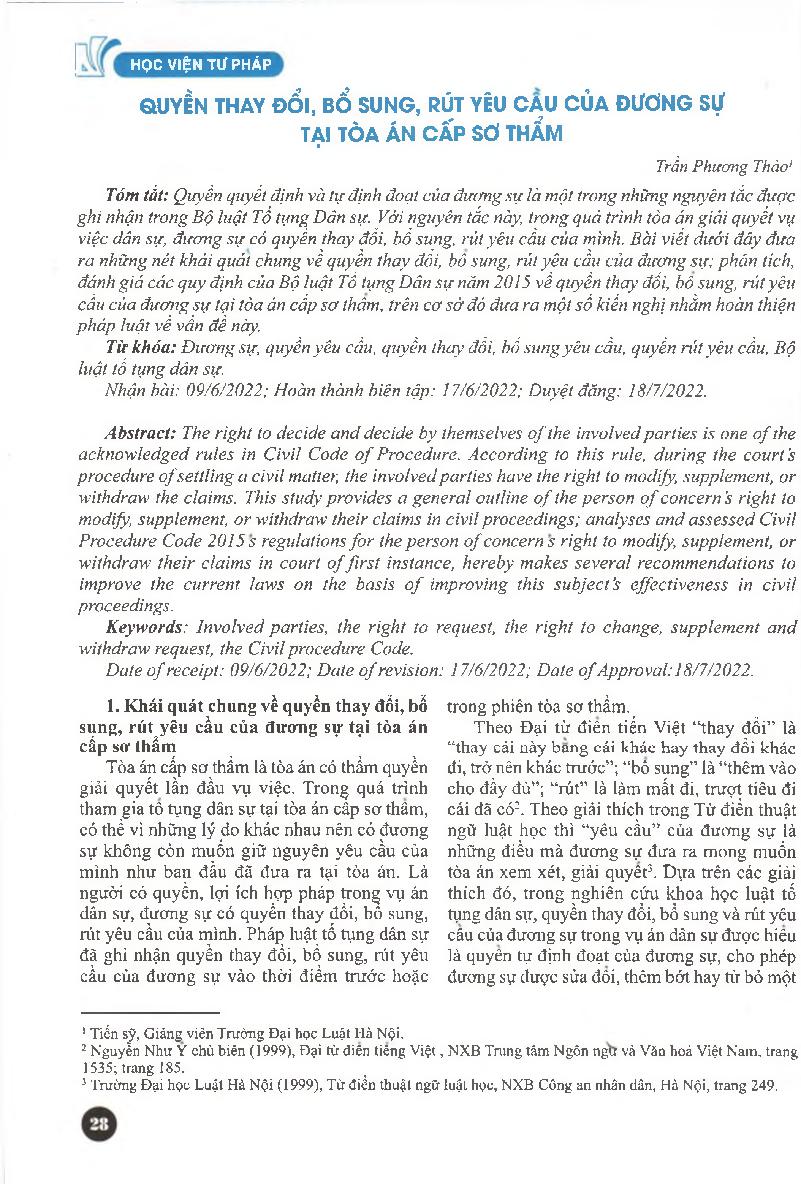 Quyền thay đổi, bổ sung, rút yêu cầu của đương sự tại tòa án cấp sơ thẩm = The right to change, supplement and withdraw request of the involved parties at the first-instance courts