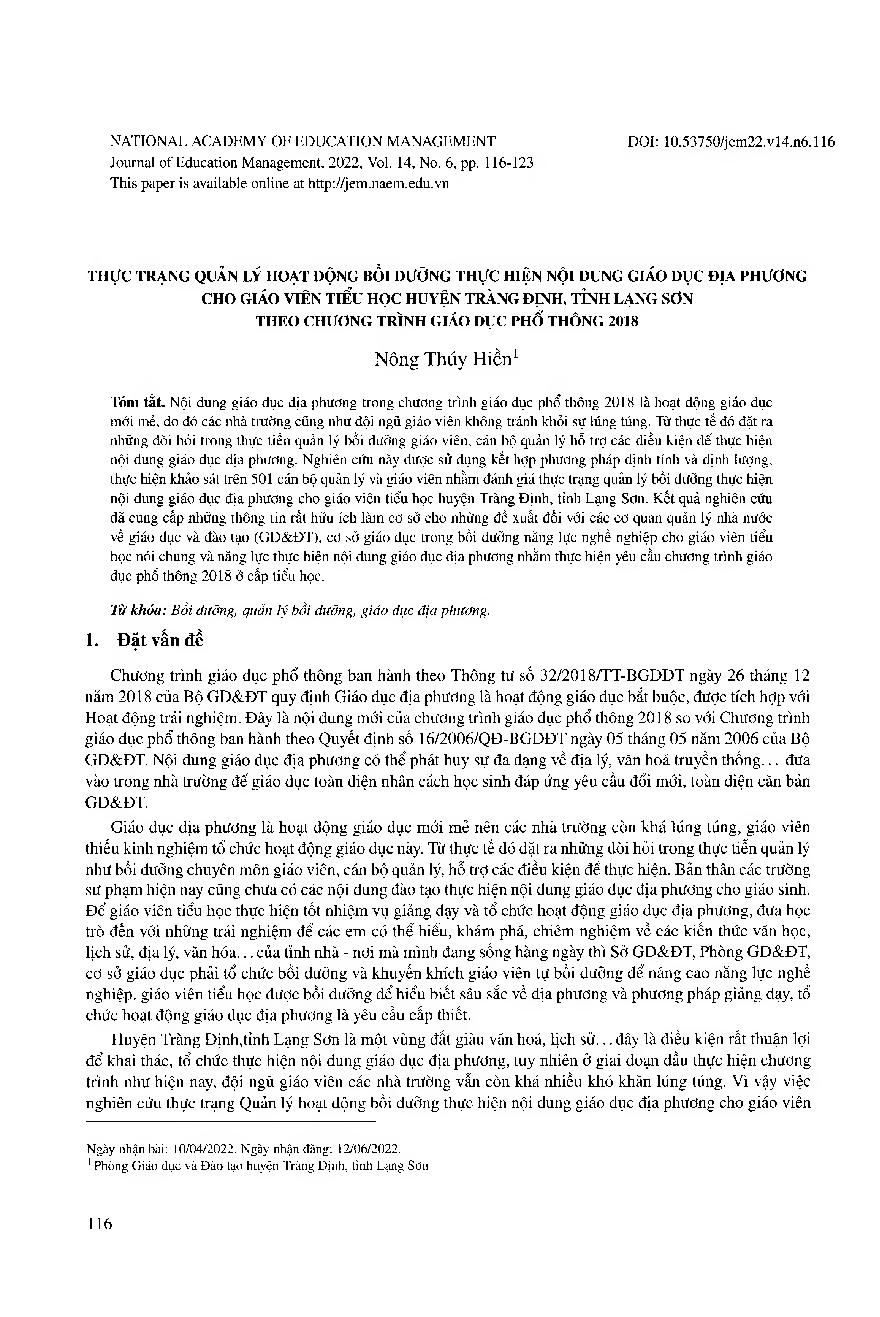 Thực trạng quản lý hoạt động bồi dưỡng thực hiện nội dung giáo dục địa phương cho giáo viên tiểu học huyện Tràng Định, tỉnh Lạng Sơn theo chương trình giáo dục phổ thông 2018 = Current situation of management of training primary school teachers of Trang D