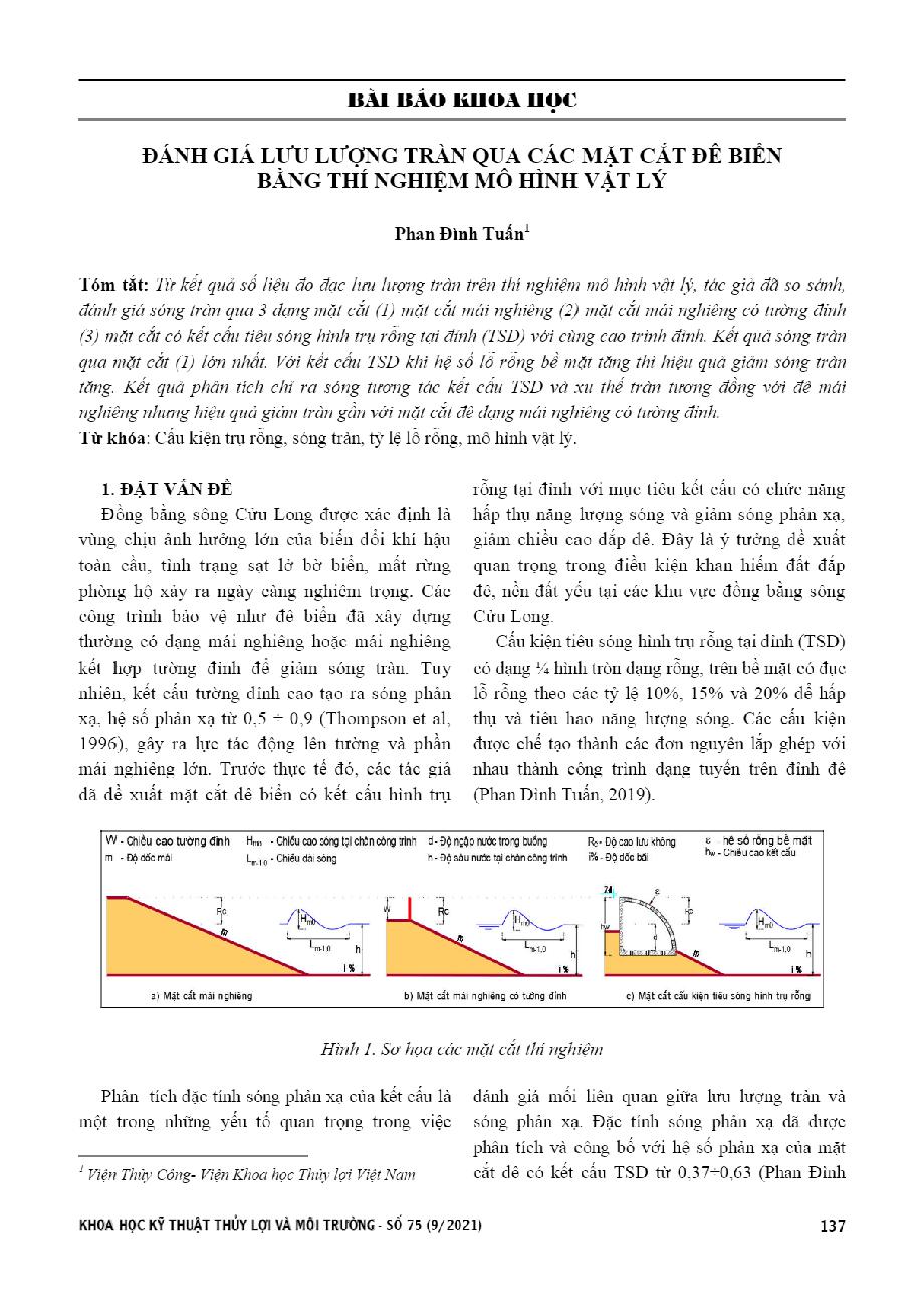 Đánh giá lưu lượng tràn qua các mặt cắt đê biển bằng thí nghiệm mô hình vật lý = Assessment of overtopping disc harge over sea dyke by physical model tests
