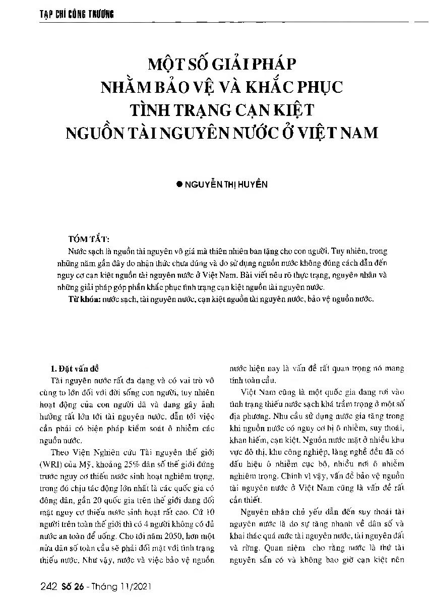 Một số giải pháp nhằm bảo vệ và khắc phục tình trạng cạn kiệt nguồn tài nguyên nước ở Việt Nam = Some solutions to solve the depletion of water resources in Vietnam