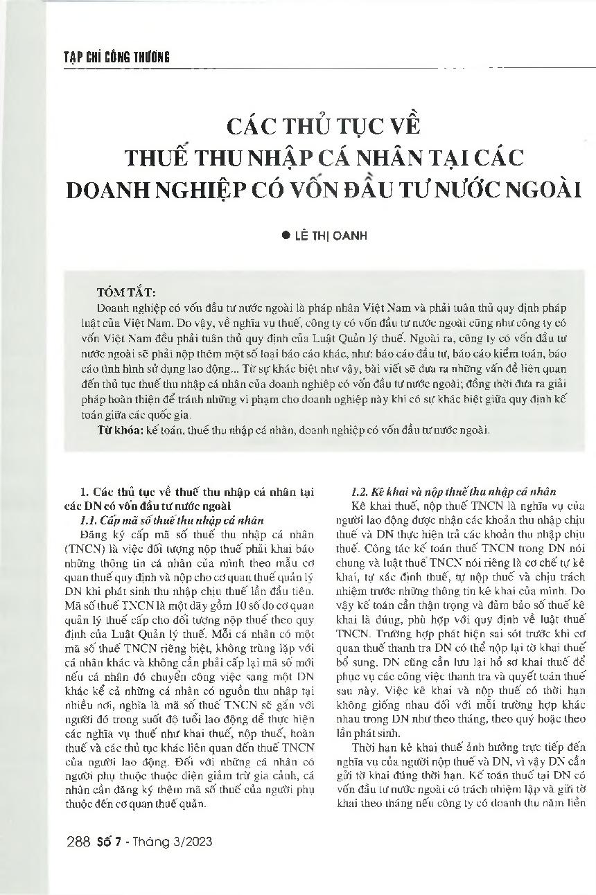 Các thủ tục về thuế thu nhập cá nhân tại các doanh nghiệp có vốn đầu tư nước ngoài = The personal income tax procedures for foreign-invested enterprises operating in Vietnam under Vietnamese laws