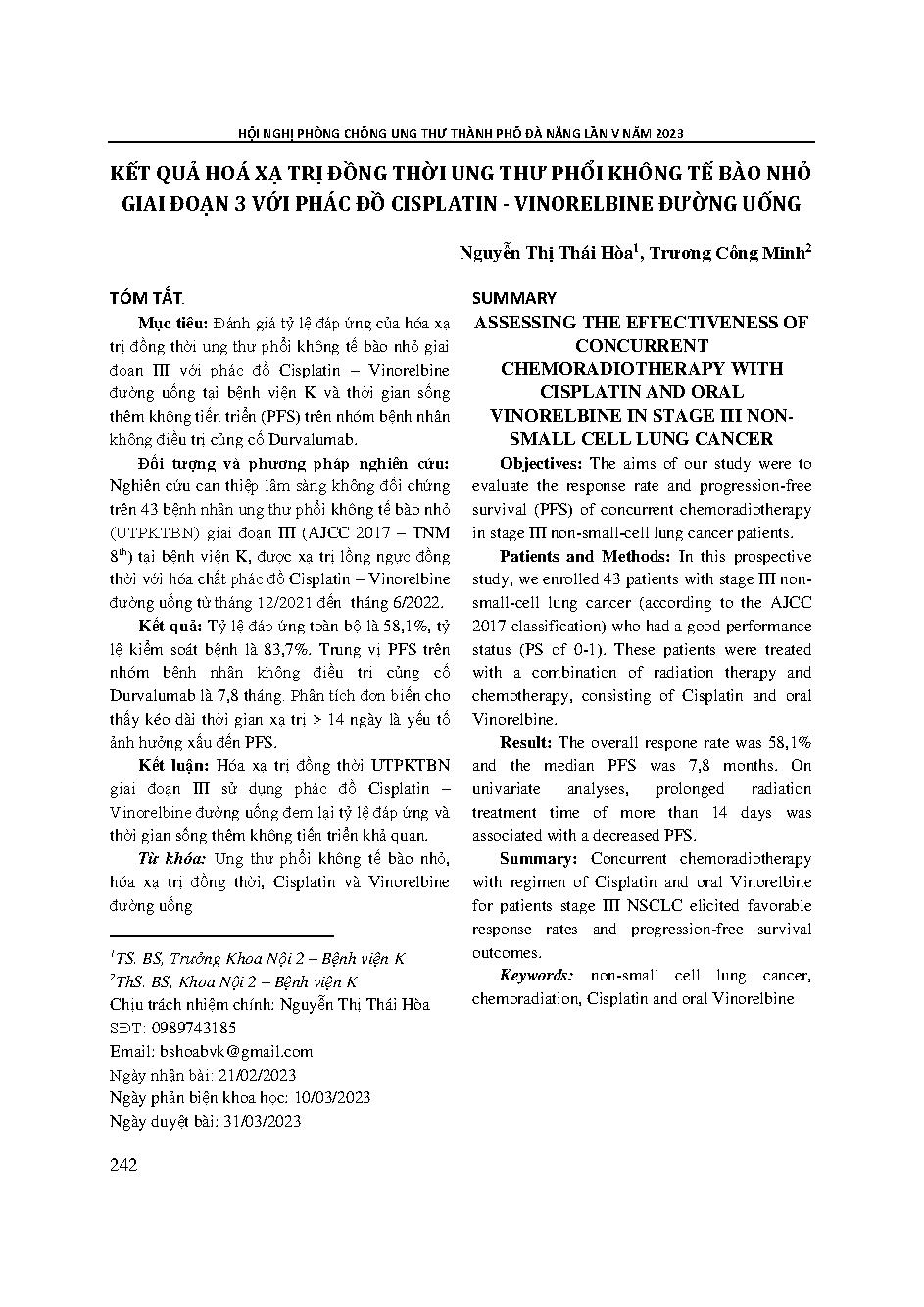 Kết quả hoá xạ trị đồng thời ung thư phổi không tế bào nhỏ giai đoạn 3 với phác đồ cisplatin - vinorelbine đường uống