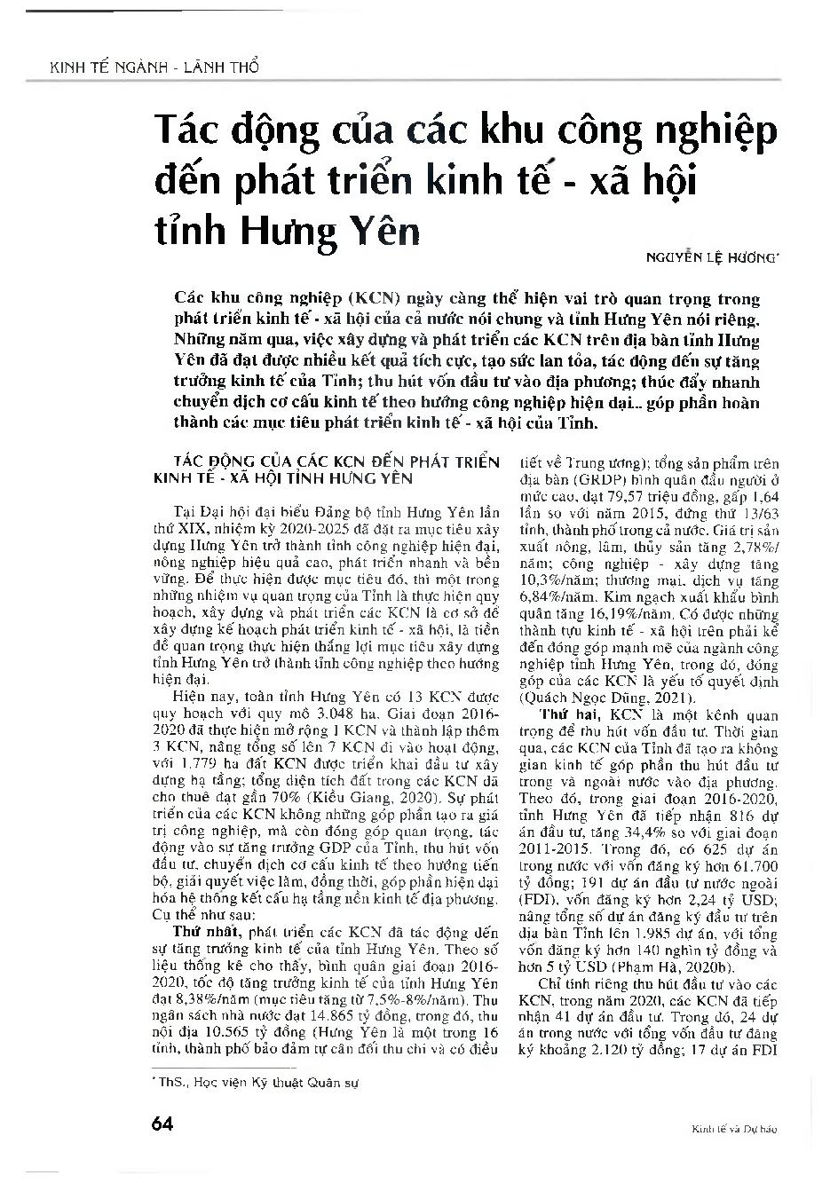 Tác động của các khu công nghiệp đến phát triển kinh tế - xã hội tỉnh Hưng Yên