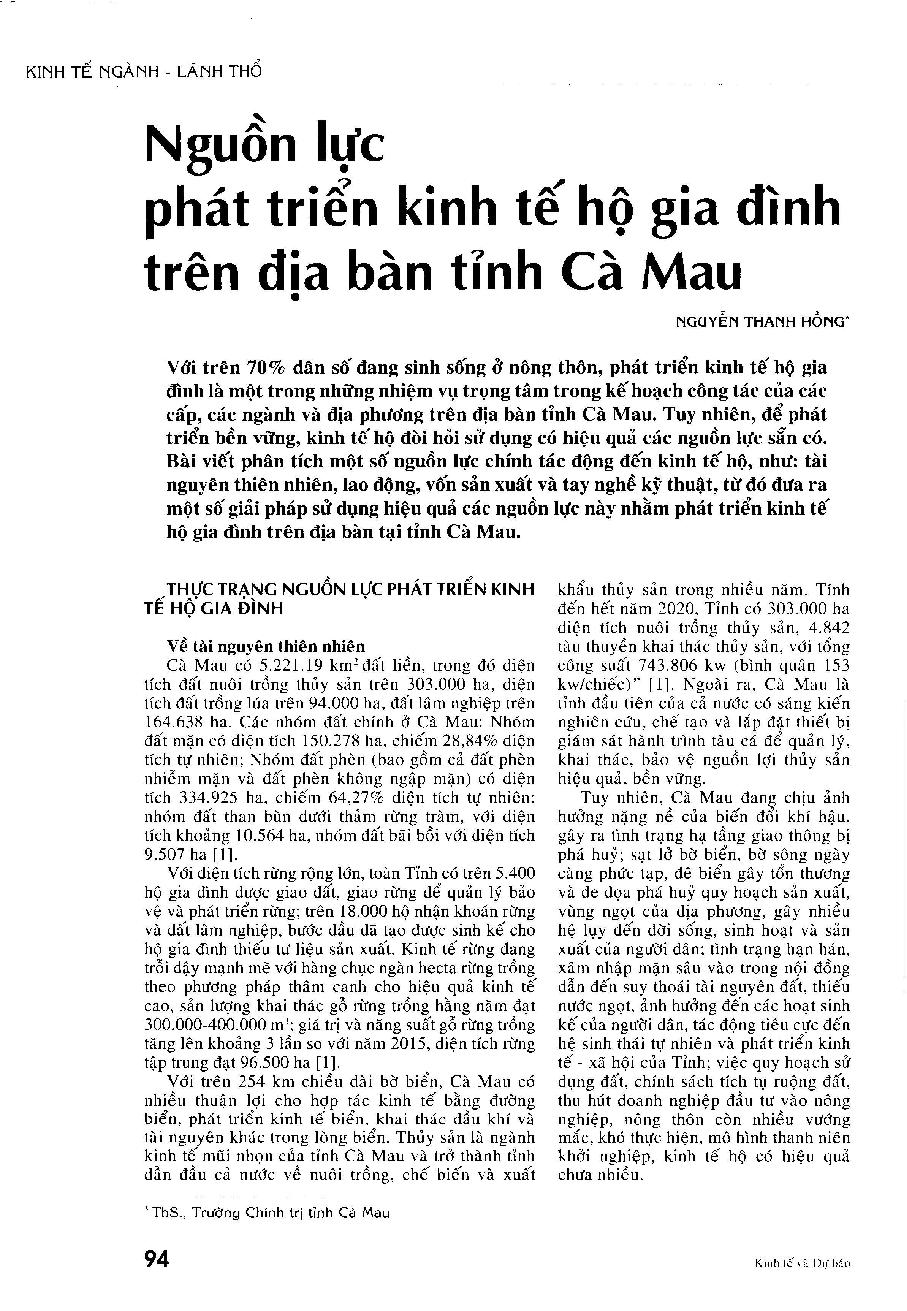 Nguồn lực phát triển kinh tế hộ gia đình trên địa bàn tỉnh Cà Mau