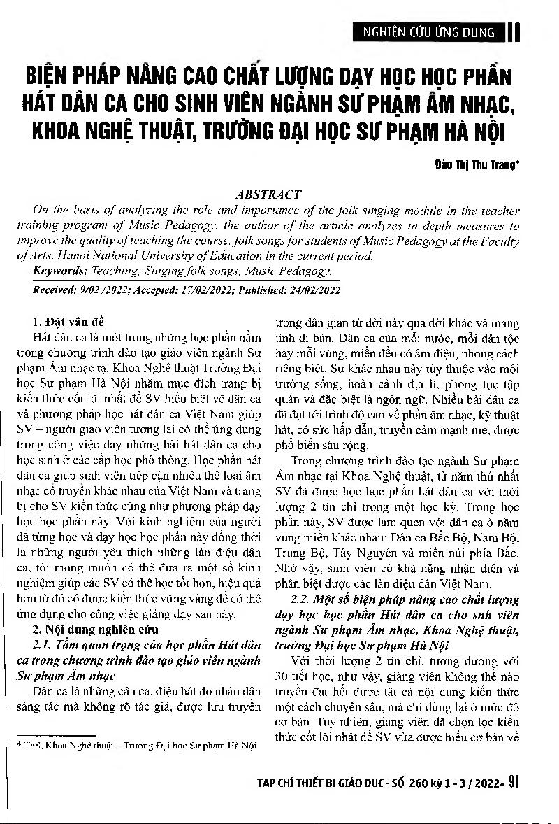 Biện pháp nâng cao chất lượng dạy học học phần Hát dân ca cho sinh viên ngành Sư phạm âm nhạc, khoa nghệ thuật, Trường Đại học Sư phạm Hà Nội = Measures of enhancing the quality of teaching in the folk song section for students of Music Pedagogy, Faculty