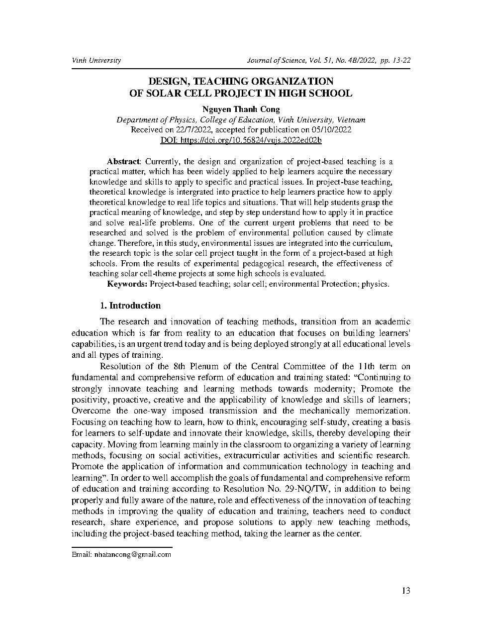 Thiết kế, tổ chức dạy học dự án pin mặt trời ở trường trung học phổ thông = Design, teaching organization of solar cell project in high school