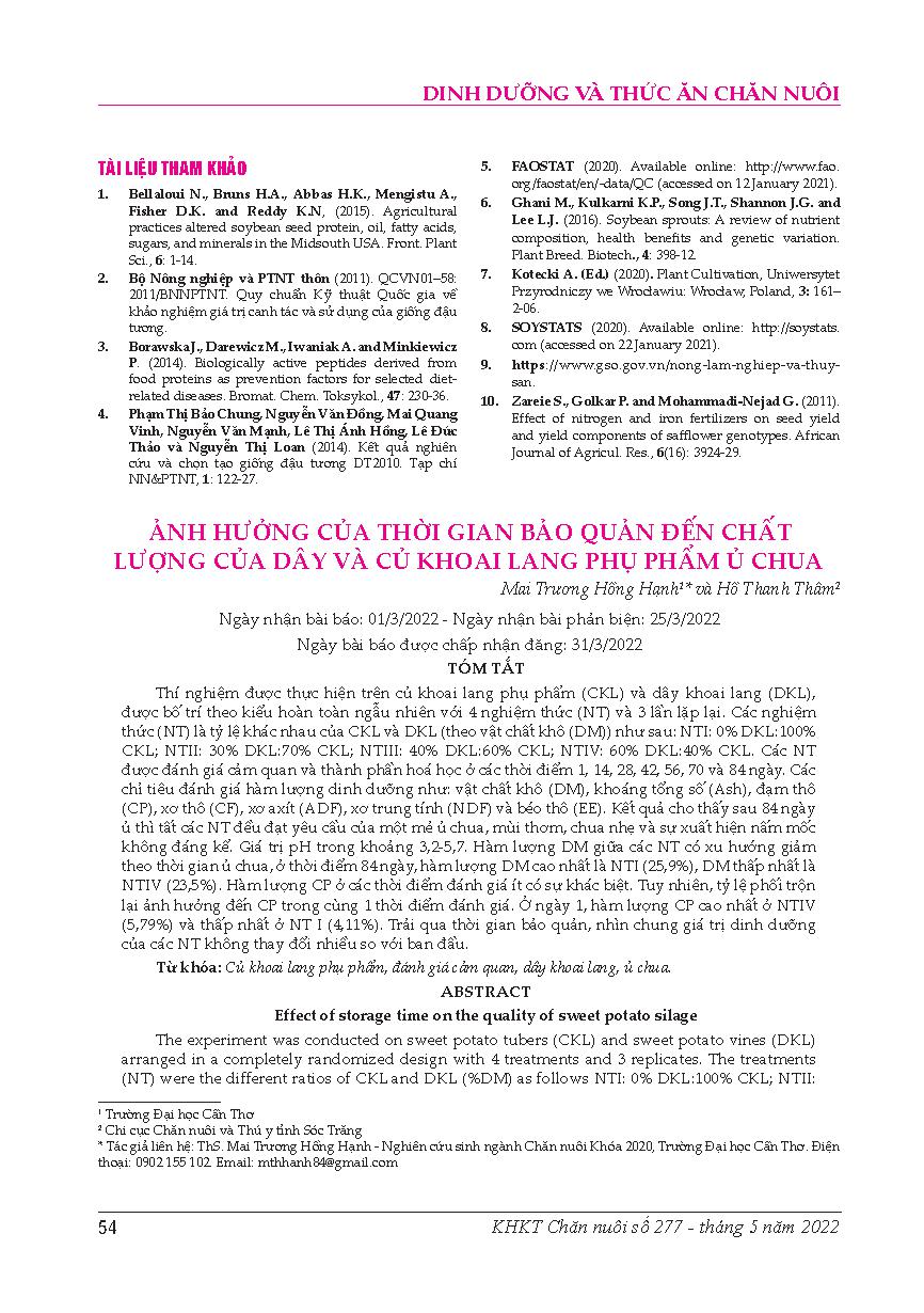 Ảnh hưởng của thời gian bảo quản đến chất lượng của dây và củ khoai lang phụ phẩm ủ chua = Effect of storage time on the quality of sweet potato silage