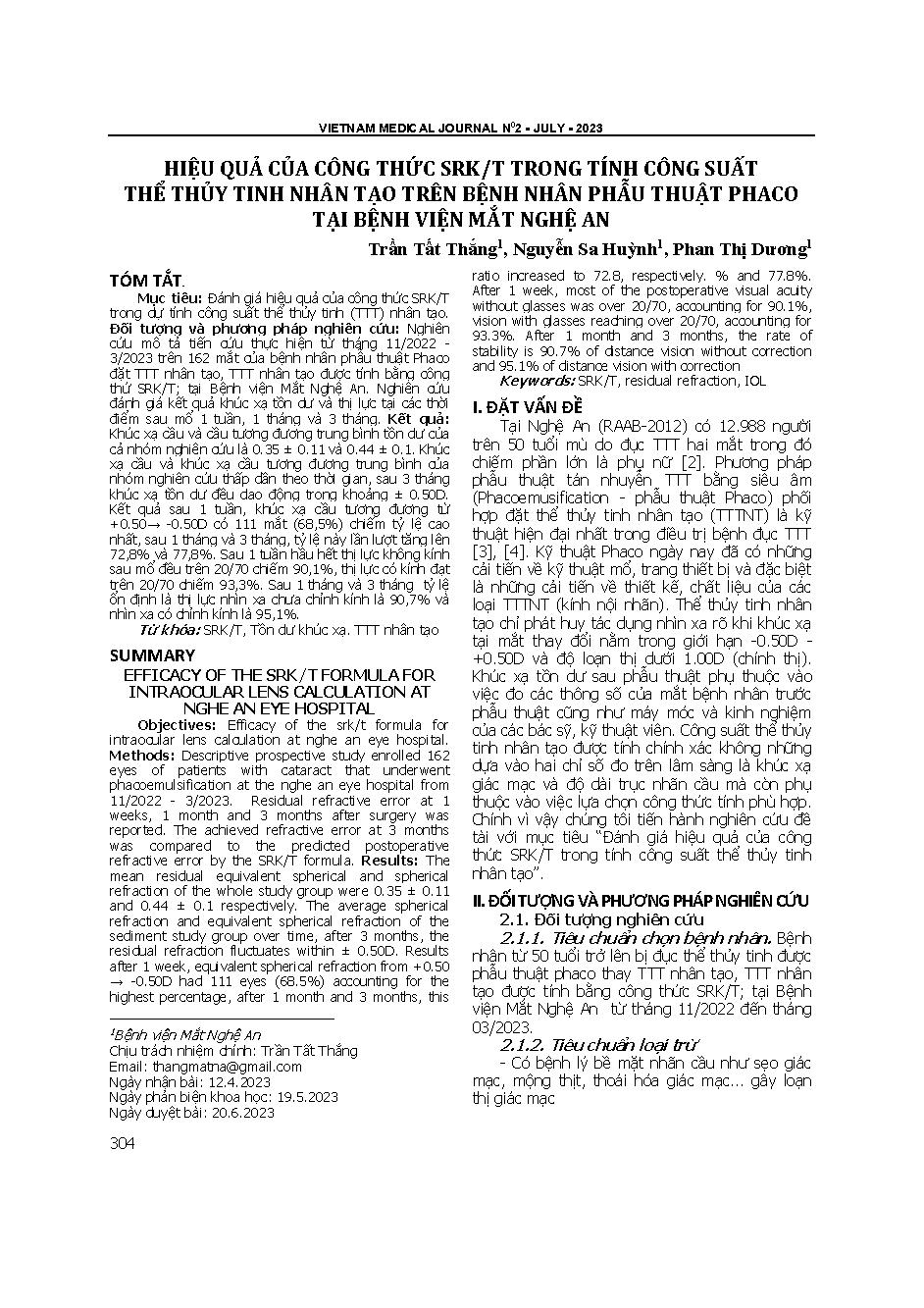 Hiệu quả của công thức SRK/T trong tính công suất thể thủy tinh nhân tạo trên bệnh nhân phẫu thuật phaco tại Bệnh viện Mắt Nghệ An