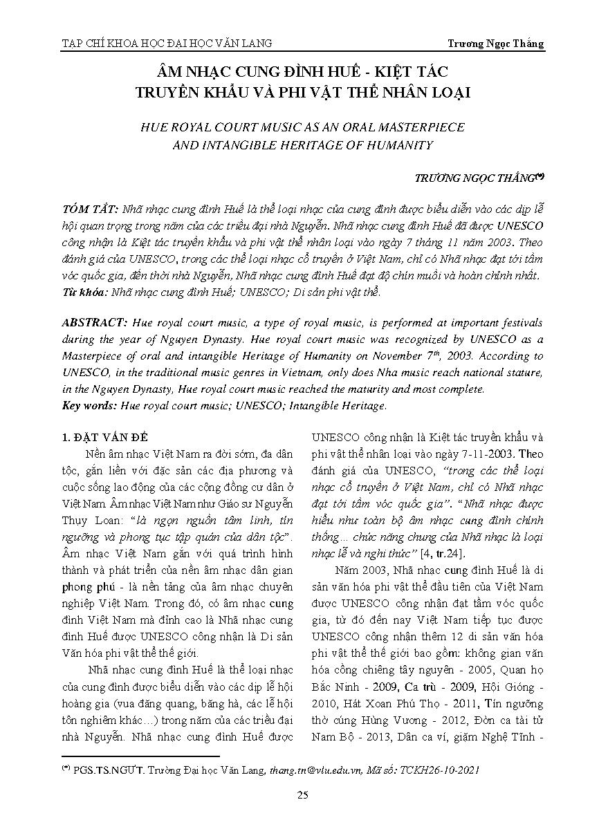 m nhạc cung đình Huế - kiệt tác truyền khẩu và phi vật thể nhân loại = Hue royal court music as an oral masterpiece and intangible heritage of humanity