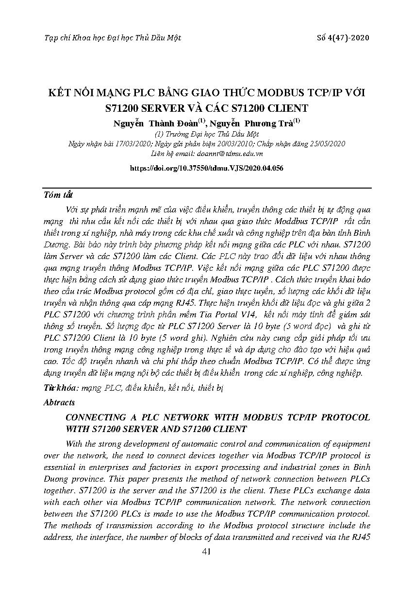 KẾT NỐI MẠNG PLC BẰNG GIAO THỨC MODBUS TCP/IP VỚI S71200 SERVER VÀ CÁC S71200 CLIENT = CONNECTING A PLC NETWORK WITH MODBUS TCP/IP PROTOCOL WITH S71200 SERVER AND S71200 CLIENT