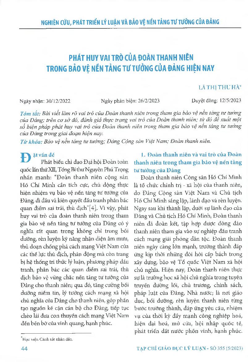 Phát huy vai trò của đoàn thanh niên trong bảo vệ nền tảng tư tưởng của Đảng hiện nay = Enhancing the Youth Union's role in defending the ideological foundation of the Party at present