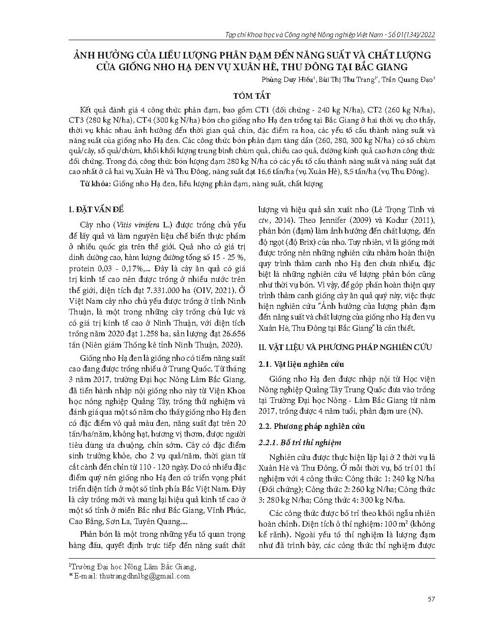 Ảnh hưởng của liều lượng phân đạm đến năng suất và chất lượng của giống nho hạ đen vụ xuân hè, thu đông tại Bắc Giang = Effects of nitrogen fertilizer dose on yield and quality of Ha den grape variety grown in Spring-Summer, Autumn-Winter in Bac Giang pro