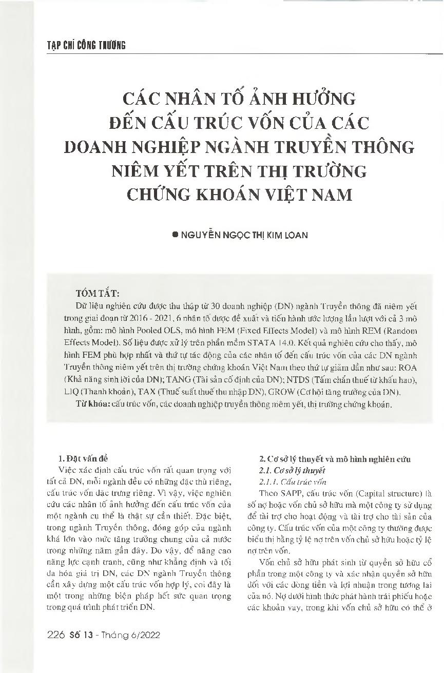 Các nhân tố ảnh hưởng đến cấu trúc vốn của các doanh nghiệp truyền thông niêm yết trên thị trường chứng khoán Việt Nam = Factors affecting the capital structure of listed media companies in Vietnam