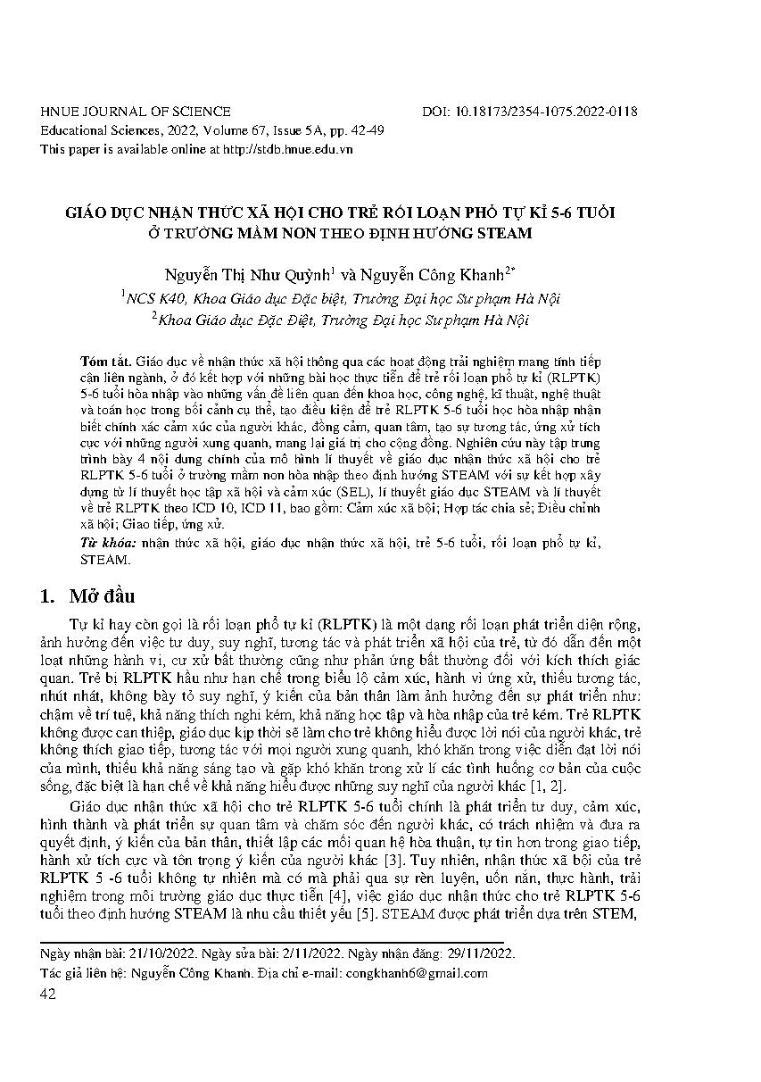 Giáo dục nhận thức xã hội cho trẻ rối loạn phổ tự kỉ 5-6 tuổi ở trường mầm non theo định hướng steam = Social awareness education for childlen with asd 5-6 years old in steam oriented preschool