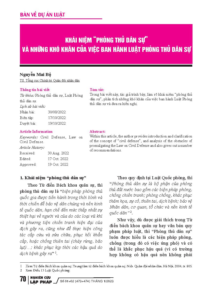 Khái niệm "phòng thủ dân sự" và những khó khăn của việc ban hành Luật Phòng thủ dân sự = The concept of "civil defense" and the difficulties of enacting the Law on Civil Defense