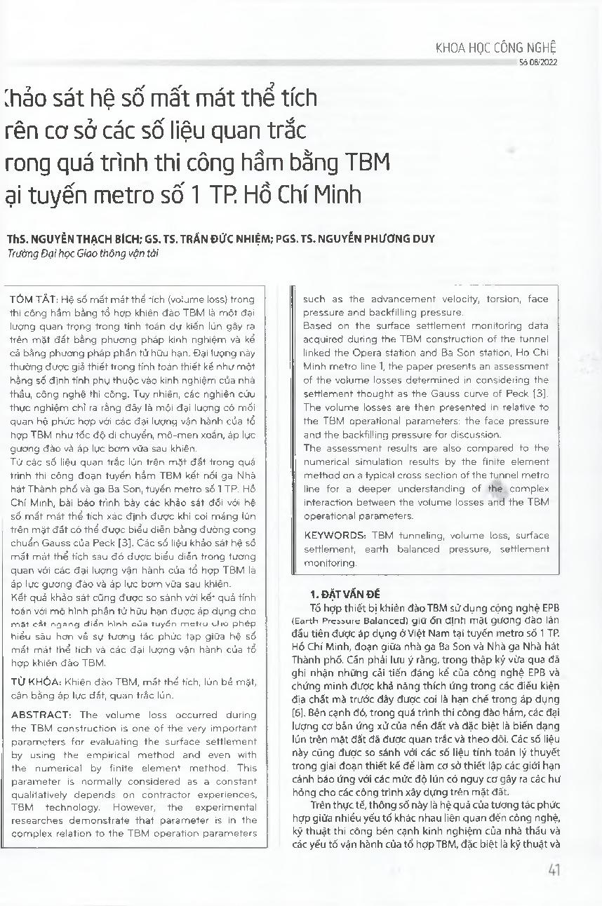 Khảo sát hệ số mất mát thể tích trên cơ sở các số liệu quan trắc trong quá trình thi công hầm bằng TBM tại tuyến metro số 1 TP. Hồ Chí Minh = Volume loss accessement based on the site monitoring data during the TBM construction at Metro Line No 1, HCMC