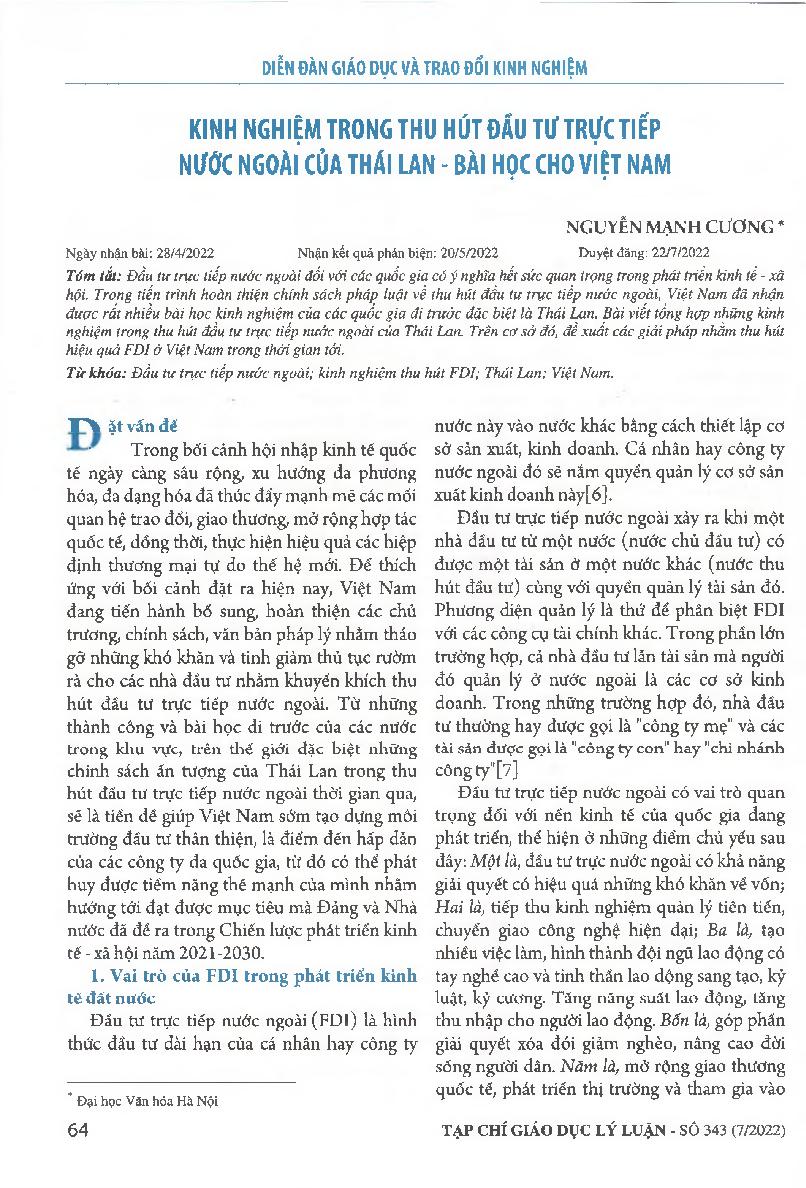Kinh nghiệm trong thu hút đầu tư trực tiếp nước ngoài của Thái Lan - bài học cho Việt Nam = Experience in attracting foreign direct investment in Thailand - Lesson learned for Vietnam
