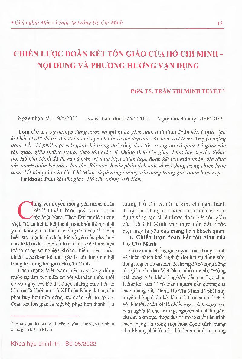 Chiến lược đoàn kết tôn giáo của Hồ Chí Minh - nội dung và phương hướng vận dụng = Ho Chi Minh&; 39;s strategy of religious solidarity - content and direction of application