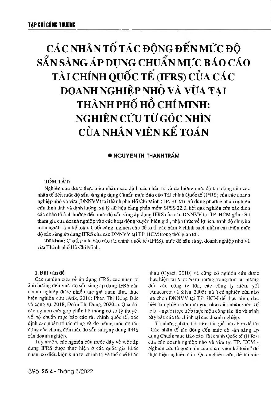 Các nhân tố tác động đến mức độ sẵn sàng áp dụng chuẩn mực báo cáo tài chính quốc tế (IFRS) của các doanh nghiệp nhỏ và vừa tại thành phố Hồ Chí Minh - Nghiên cứu từ góc nhìn của nhân viên kế toán = Factor affecting the readiness to apply International Fi