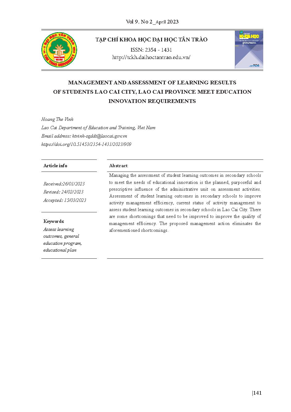 Quản lý hoạt động đánh giá kết quả học tập của học sinh ở các trường THCS thành phố Lào Cai, tỉnh Lào Cai đáp ứng yêu cầu đổi mới giáo dục = Management and assessment of learning results of students Lao Cai city, Lao Cai province meet education innovation