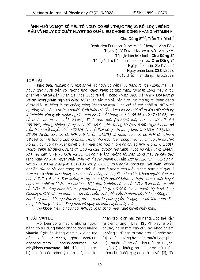 Ảnh hưởng một số yếu tố nguy cơ đến thực trạng rối loạn đông máu và nguy cơ xuất huyết do quá liều chống đông kháng vitamin K