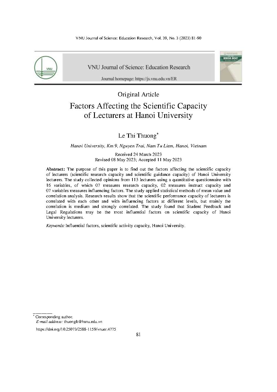 Các yếu tố ảnh hưởng đến năng lực hoạt động khoa học của giảng viên Trường Đại học Hà Nội = Factors Affecting the Scientific Capacity of Lecturers at Hanoi University