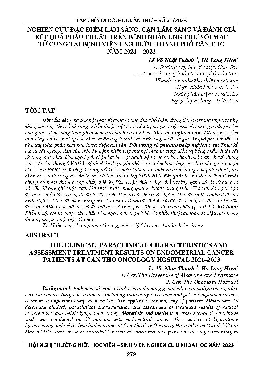 Nghiên cứu đặc điểm lâm sàng, cận lâm sàng và đánh giá kết quả phẫu thuật trên bệnh nhân ung thư nội mạc tử cung tại Bệnh viện Ung bướu thành phố Cần Thơ năm 2021 – 2023 = The clinical, paraclinical characteristics and assessment treatment results on endo