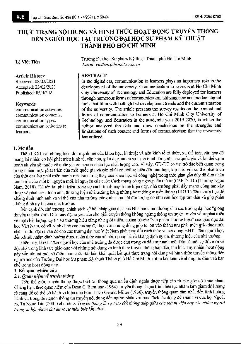 Thực trạng nội dung và hình thức hoạt động truyền thông đến người học tại Trường Đại học Sư phạm Kỹ thuật Thành phố Hồ Chí Minh