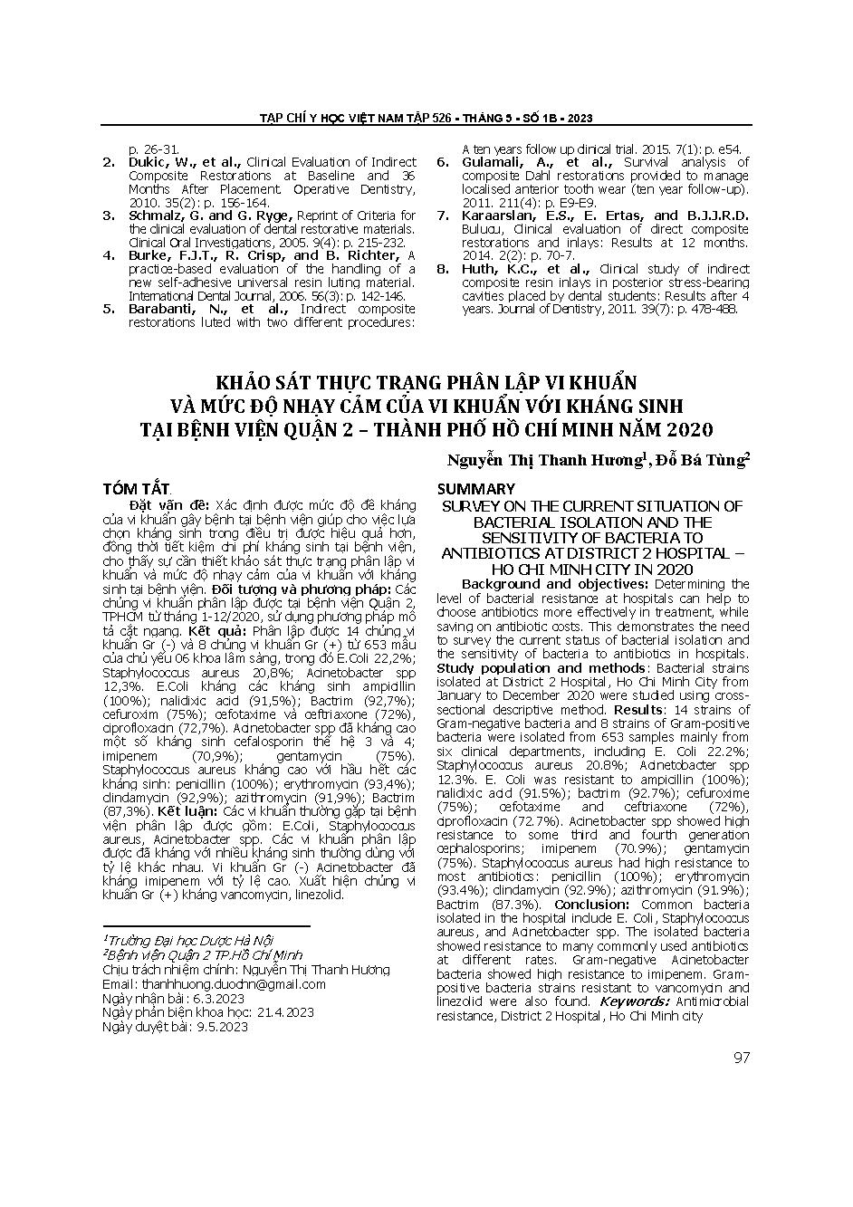 Khảo sát thực trạng phân lập vi khuẩn và mức độ nhạy cảm của vi khuẩn với kháng sinh tại Bệnh viện Quận 2 - Thành phố Hồ Chí Minh năm 2020 = Survey on the current situation of bacterial isolation and the sensitivity of bacteria to antibiotics at district