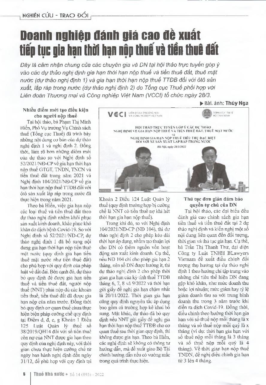 Doanh nghiệp đánh giá cao đề xuất tiếp tục gia hạn thời hạn nộp thuế và tiền thuê đất = Enterprises appreciate the proposal to continue to extend the deadline for paying taxes and land rent