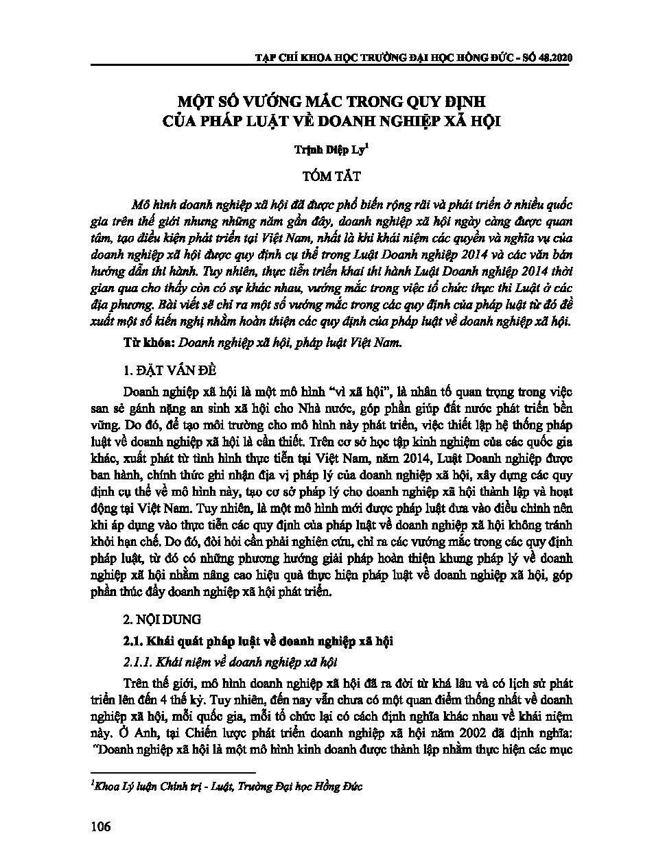 MỘT SỐ VƯỚNG MẮC TRONG QUY ĐỊNH CỦA PHÁP LUẬT VỀ DOANH NGHIỆP XÃ HỘI = SOME PROBLEMS IN THE LAWS ON SOCIAL ENTERPRISES