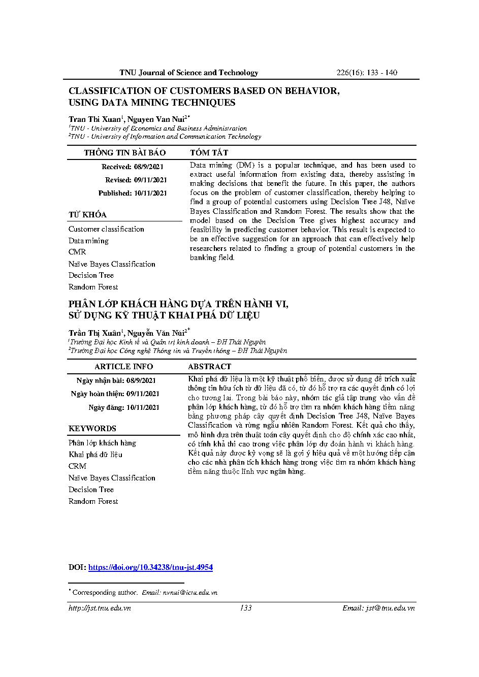 Phân lớp khách hàng dựa trên hành vi, sử dụng kỹ thuật khai phá dữ liệu = Classification of customers based on behavior, using data mining techniques