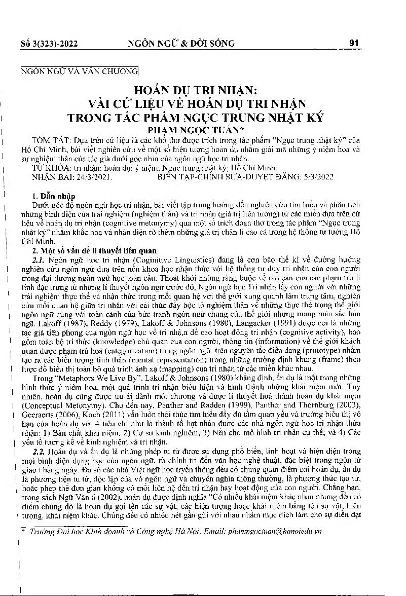 Hoán dụ tri nhận: vài cứ liệu về hoán dụ tri nhận trong tác phẩm Ngục trung nhật ký = Cognitive metonymy: evidence on metonymical perceptiveness from