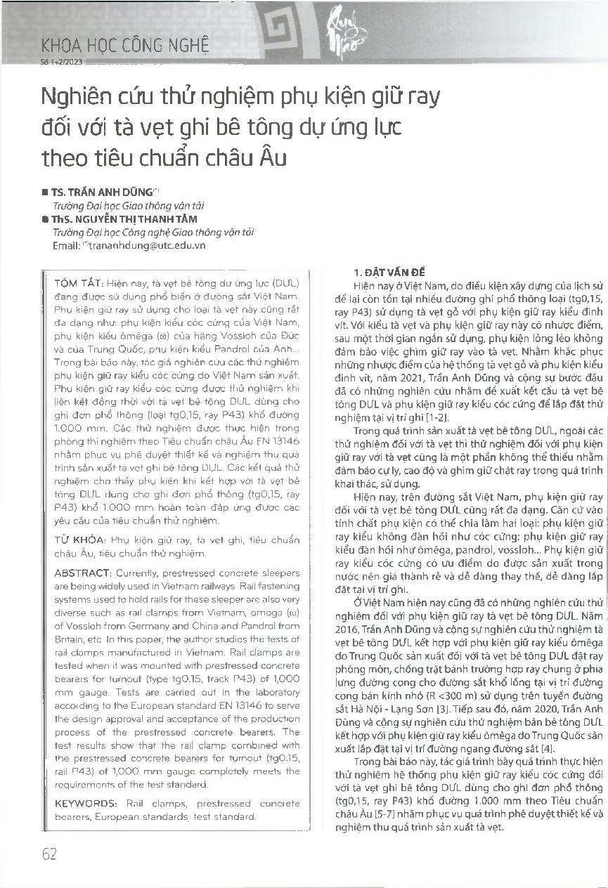 Nghiên cứu thử nghiệm phụ kiện giữ ray đối với tà vẹt ghi bê tông dự ứng lực theo tiêu chuẩn châu Âu = Experimental study on the fastening system of prestressed concrete sleepers according to European standards