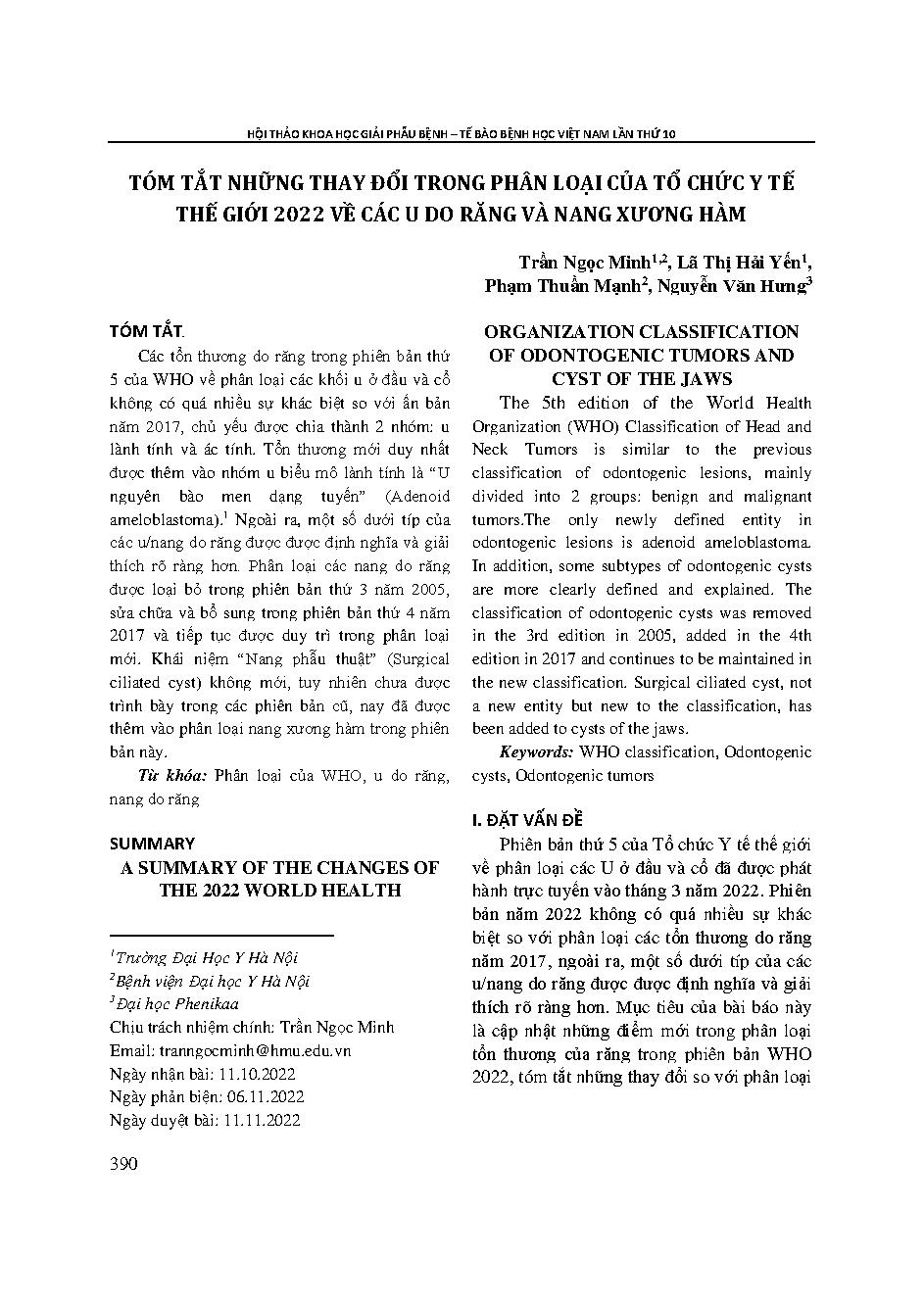 Tóm tắt những thay đổi trong phân loại của Tổ chức Y tế thế giới 2022 về các u do răng và nang xương hàm = A summary of the changes of the 2022 World health organization classification of odontogenic tumors and cyst of the jaws