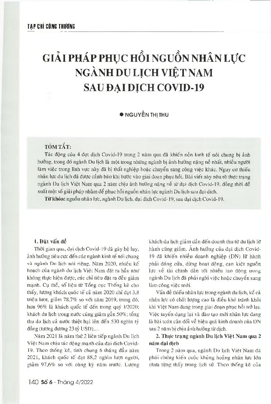 Giải pháp phục hồi nguồn nhân lực ngành Du lịch Việt Nam sau đại dịch Covid-19 = Solutions to recover the human resources for Vietnam&; 39;s tourism industry after the COVID-19 pandemic