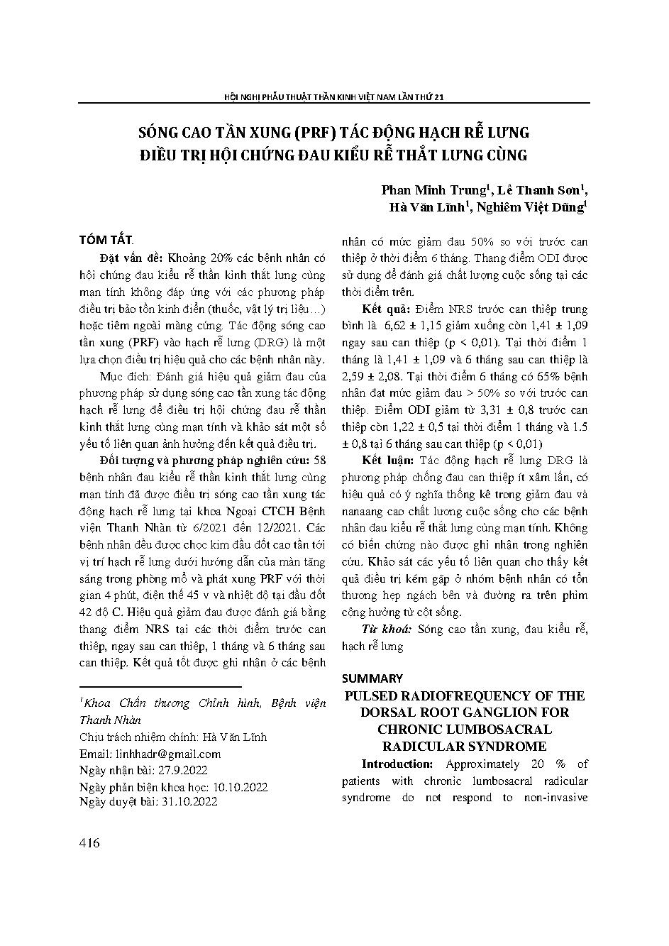 Sóng cao tần xung (PRF) tác động hạch rễ lưng điều trị hội chứng đau kiểu rễ thắt lưng cùng = Pulsed radiofrequency of the dorsal root ganglion for chronic lumbosacral radicular syndrome