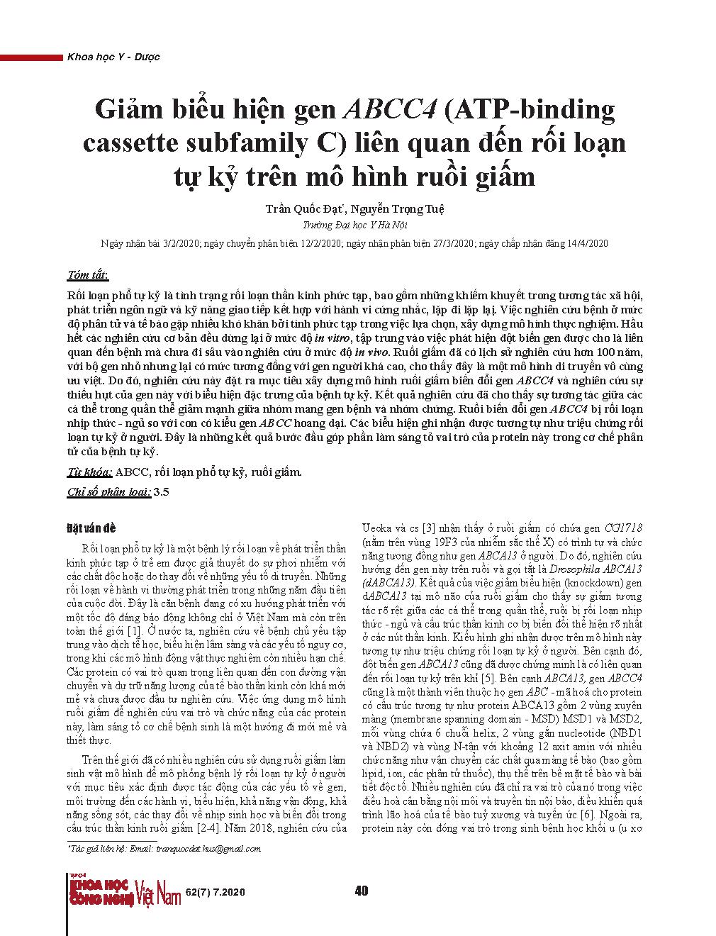 Giảm biểu hiện gen ABCC4 (ATP-binding cassette subfamily C) liên quan đến rối loạn tự kỷ trên mô hình ruồi giấm = Reduction of the ATP-binding cassette sub-family C member 4 (ABCC4) related to the expression of autism spectrum disorder on Drosophila melanogaster model